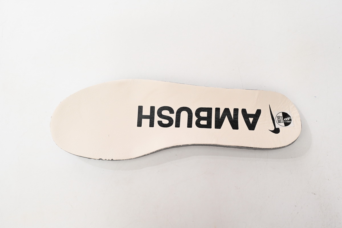 Ambush and Nike used an off-white Phantom colorway from top to bottom on their Air Force 1 collaboration. Nike used an oversized black swoosh that hangs off the heel, and black AMBUSH branding on the tongue, lace-locks, and insoles.