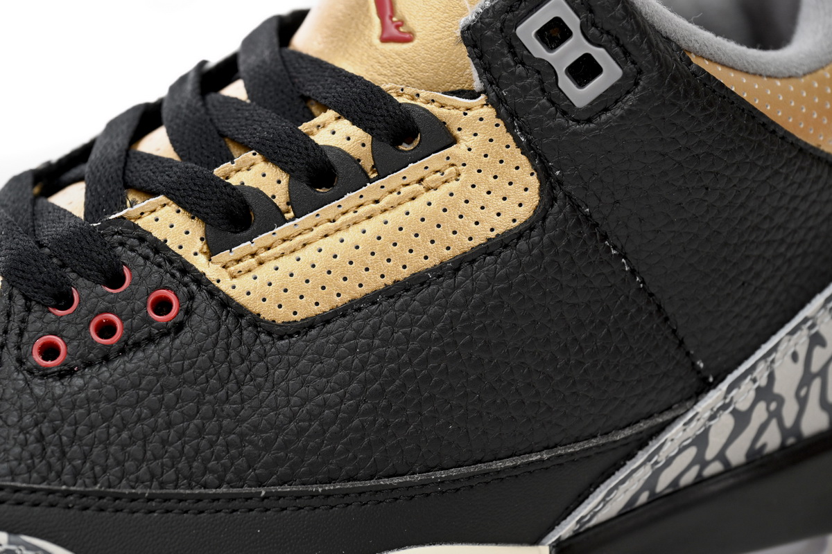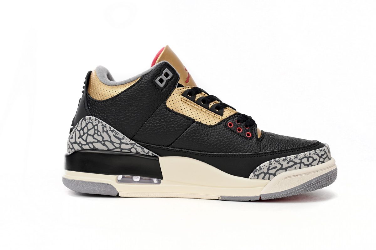 The Jordan 3 Retro Black Cement Gold W, featuring black/grey elephant-designed overlays and a black leather upper, is an addition in the Women's catalog.