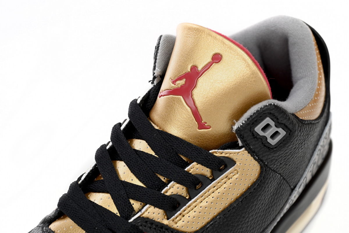 The sneaker features a metallic gold tone found at the ankle collar, around the eyelets, and at the tongue. The tongue, however, is accented with a red color that includes the Jumpman logo on it. Another emblem is displayed at the rear of the shoe. The sole unit comprises a lightly white-shaded midsole that sits on top of a grey outsole with a traction pattern.