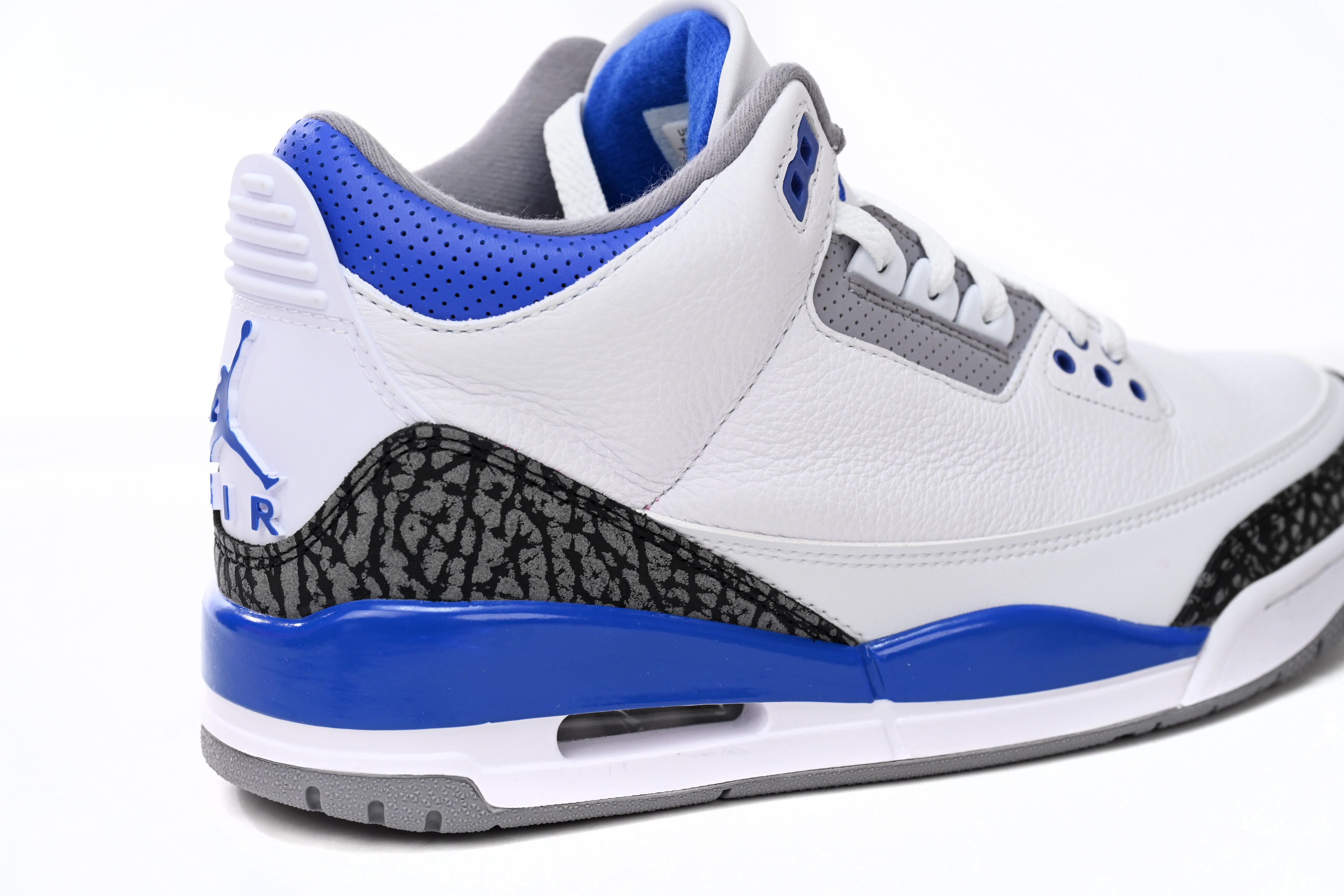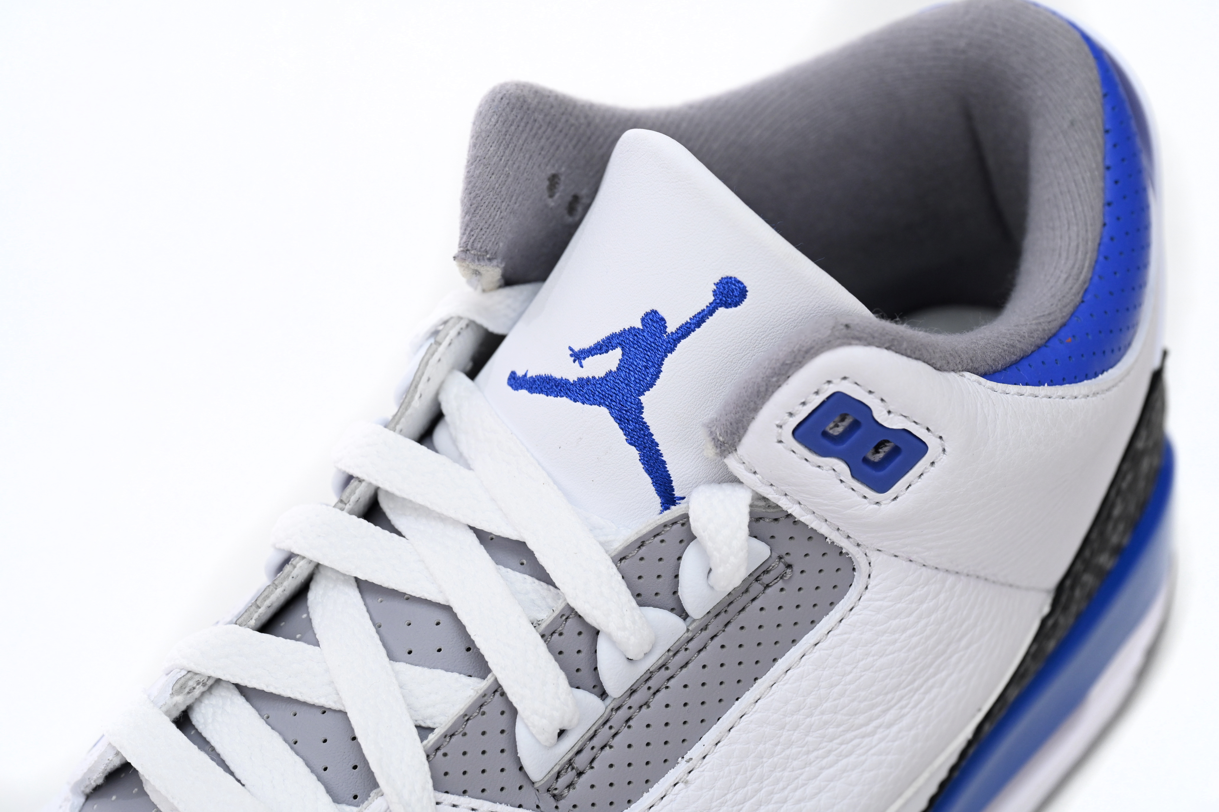 The Air Jordan 3 Racer Blue features a white tumbled leather upper with grey perforated leather eyestays and Cement overlays. From there, hits of Racer Blue on the Jumpman logos and midsole add vibrance to the classic model.